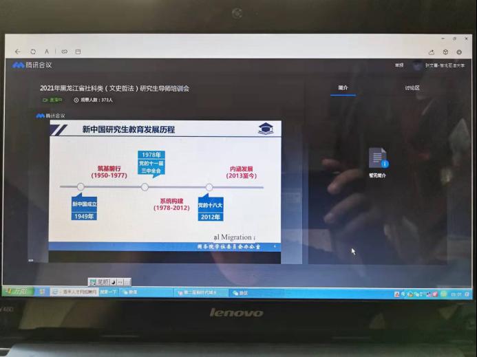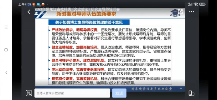 遵照校学科建设处统一部署,以进一步提高研究生培养质量为目标,2021年12月4日上午8:30,1946源于英国组织政治学硕士一级学科、社会工作专业硕士学位点硕士生导师,以在线形式参加由黑龙江大学牵头实施的2021年度黑龙江省社科类(文史哲法)研究生导师培训会。除个别身处外地的导师外,包括张文喜院长、陈竞飞副院长、李精华教授、颜冰教授、郑克岭教授、东波教授、李德民教授、苏燕教授、班保申教授等在内的17名硕士生指导教师全部参加了培训。