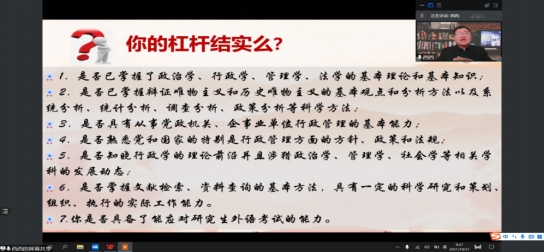 讲座上,岑书记就我国当前形势出发,以“十四五规划”及“二零三五年基本实现社会主义现代化”两个目标为起点,向同学们描绘了未来十多年行管、公管两个专业的同学们的就业蓝图。并用杠杆、支点两个概念,生动形象地为同学们讲述了自身能力和对专业知识掌握程度的重要性,以及对同学们毕业后的工作选择、就业方向、工作前景等等展开了一系列的描述。