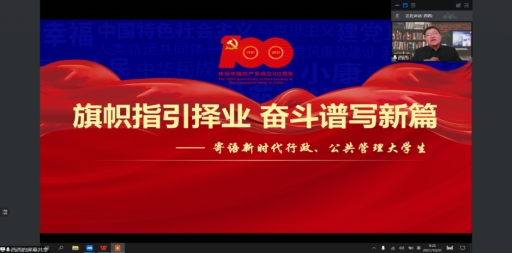 2021年10月31日星期日上午,大庆府民物业管理有限公司西城区项目党支部书记岑国权在我院公共管理系盛情邀请下,利用腾讯会议直播平台为行管、公管专业2018级学子开展毕业实习系列讲座-《旗帜指引择业,奋斗谱写新篇》。我院黄鹏程院长、郑克岭、颜冰、史春媛、徐晔、韩磊娟、姜郸等老师及2018级全体同学参加本次活动。