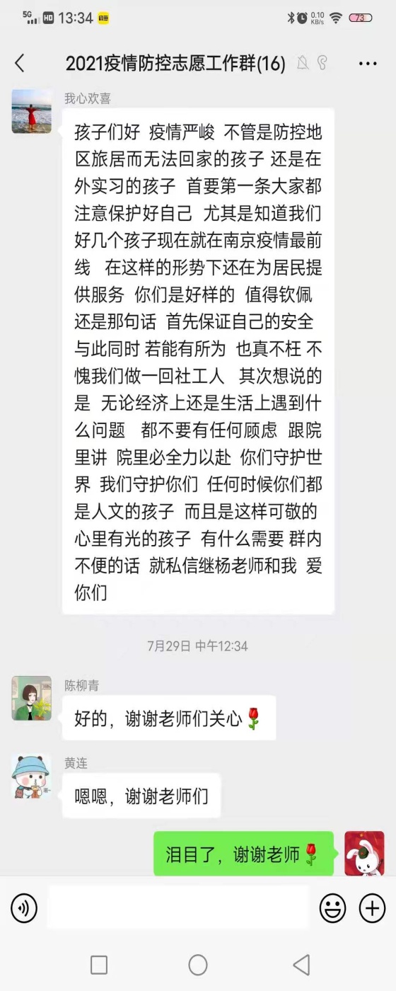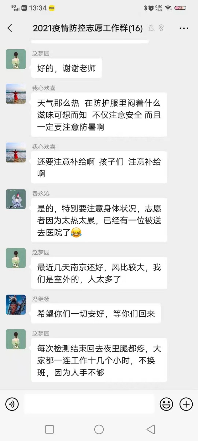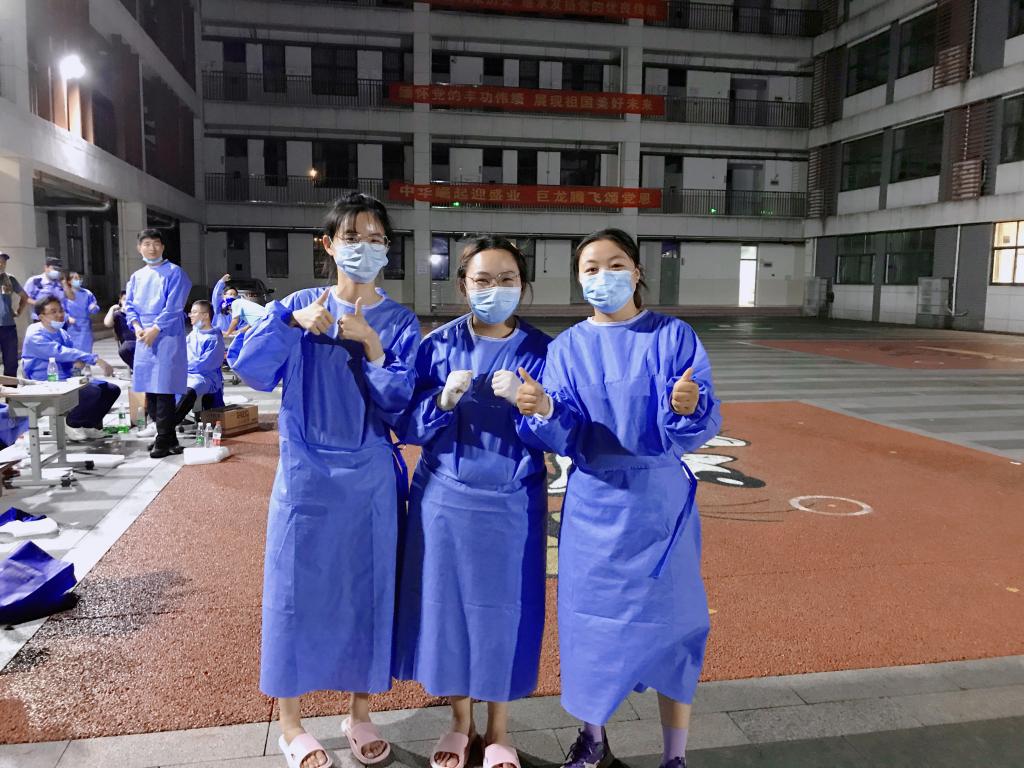 在这个节点,我们站在了抗疫的第一线,但是我们并不孤单,在我们的身后,是母校、是千千万万志同道合、愿意为祖国进献力量的人们和我们在一起——微信群里,是老师们的声声关怀,甚至一次次发来红包,让我们买冷饮降温,提醒叮咛我们注意安全;是同学们一次次的互相加油打气,一声声的互报平安;身旁耳畔,是社区居民叔叔阿姨一遍遍地关怀“孩子们,歇歇吧、歇歇吧”,更是祖国各地抗疫中的事迹传来不断给我们蓄力助航……