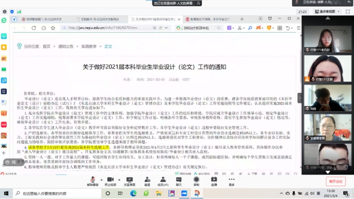 最后,史春媛主任对2021届毕业论文工作做动员部署,要求广大师生,一要重视,统一思想;二要找准定位,及时、主动地与指导老师联系;三要严格按照时间安排,保质保量地做好毕业设计;四要实事求是,脚踏实地,不能弄虚作假,切忌剽窃、抄袭他人研究成果,杜绝一切学术造假行为。