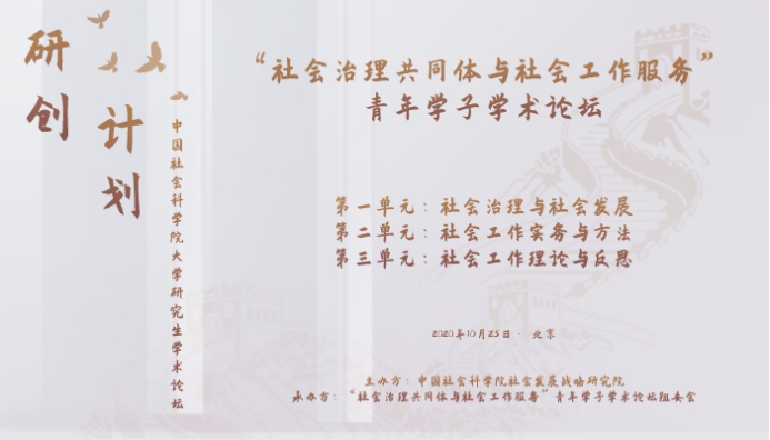 2020年10月25日,由中国社会科学院大学“研究生科研创新支持计划”支持,中国社会科学院社会发展战略研究院主办、“社会治理共同体与社会工作服务”青年学子学术论坛组委会承办的“社会治理共同体与社会工作服务”线上论坛成功举办。此次论坛吸引了来自中国社会科学院大学、西北政法大学、伟德国际1946、华东理工大学、苏州大学、华南农业大学在内的多所高校的社会工作本、硕学生。