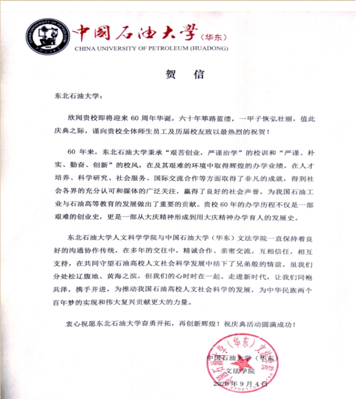 六十载风雨兼程,六十载教人育人,我们深切感激母校的栽培,也密切关注着母校的建设和发展,时刻希望能有机会为母校贡献绵薄之力。在东油六十华诞之际,祝愿母校在建设高水平大学和世界一流大学的路上脚步坚实,再谱华章!