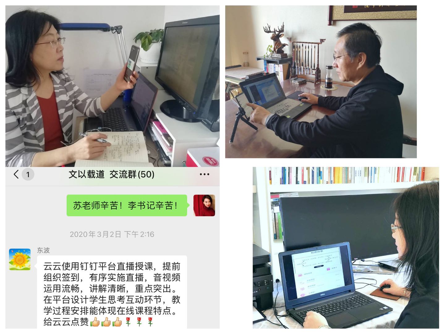 一周来,为了真真正正切切实实地保证教学效果,老师们克服了太多意想不到的困难:因家中设备陈旧影响直播,有教师火线订购快递笔记本电脑、高价购置录屏装置;因环境嘈杂影响录制,有教师苦等孩子入睡后,通宵达旦抢拍MV;有教师反复比较不同平台,不惜一次次推到重来,3天更换4个平台;有教师义无反顾帮助全系老师熟悉操作技巧,全程甘当陪练,数小时视频连线远程指导;有教师为避免干扰直播,让老人带孩子在室外待了整整一晚;有老师为直播21点才吃第一顿饭,有老师给学生答疑一答就答到凌晨1点,有老师把两个箱子摞起来垫放直播设备、移动时甚至不惜让家人举着,有老师开课后全家一直光脚走路、每天棉被塞门缝上确保环境无杂音……