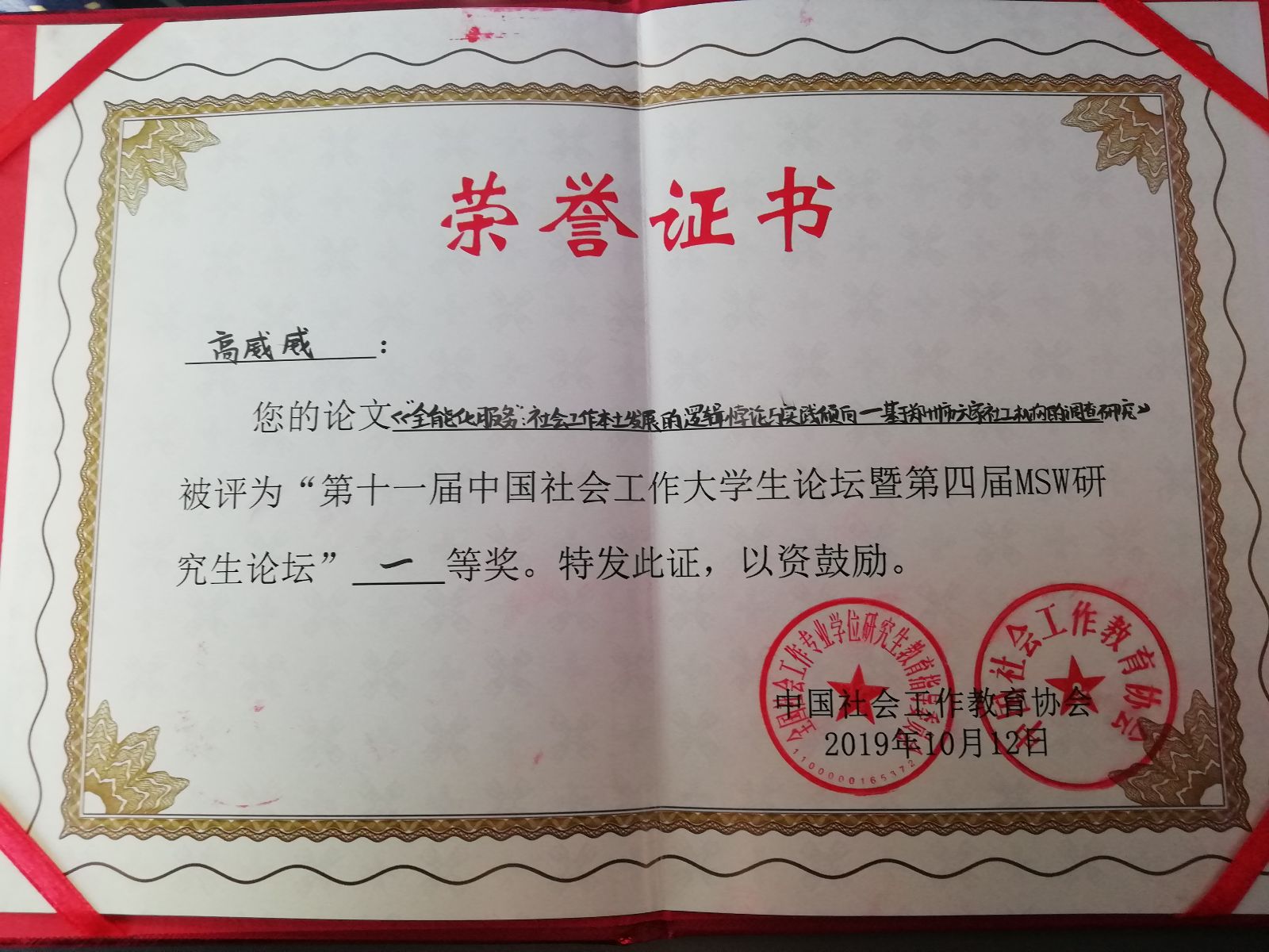 社会工作专业高威威同学首获中国社会工作大学生论坛暨MSW研究生论坛一等奖