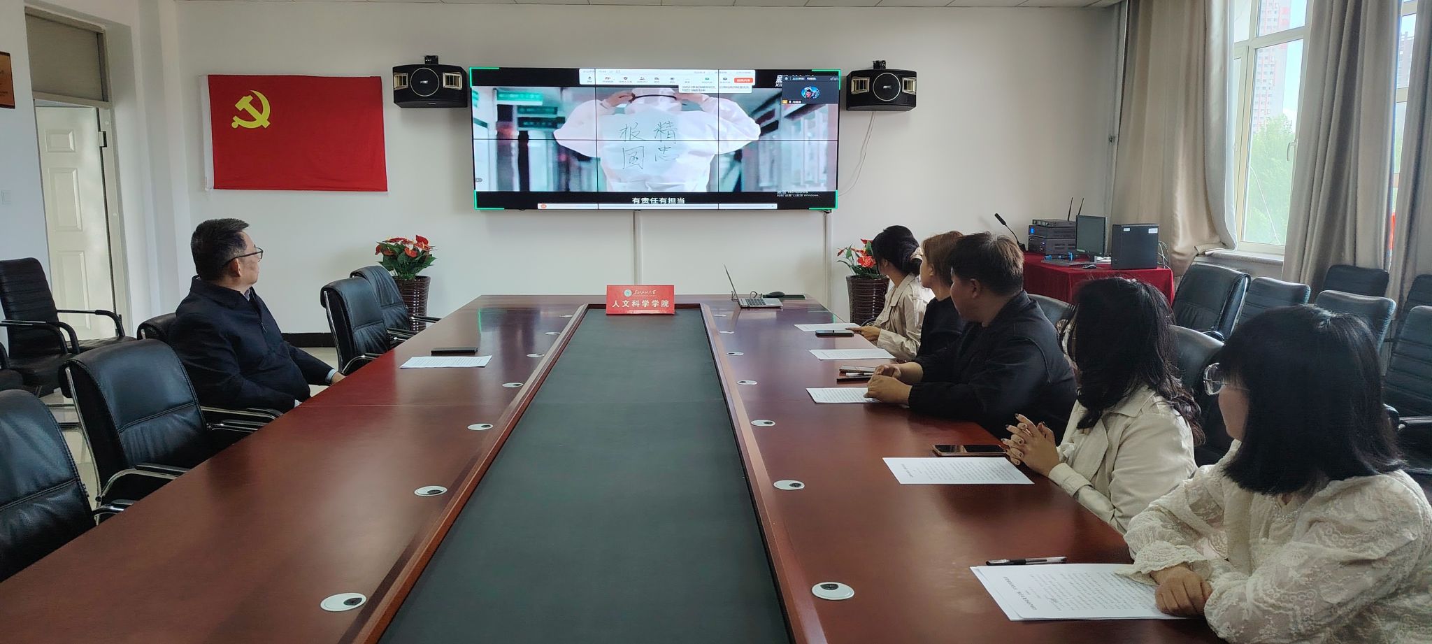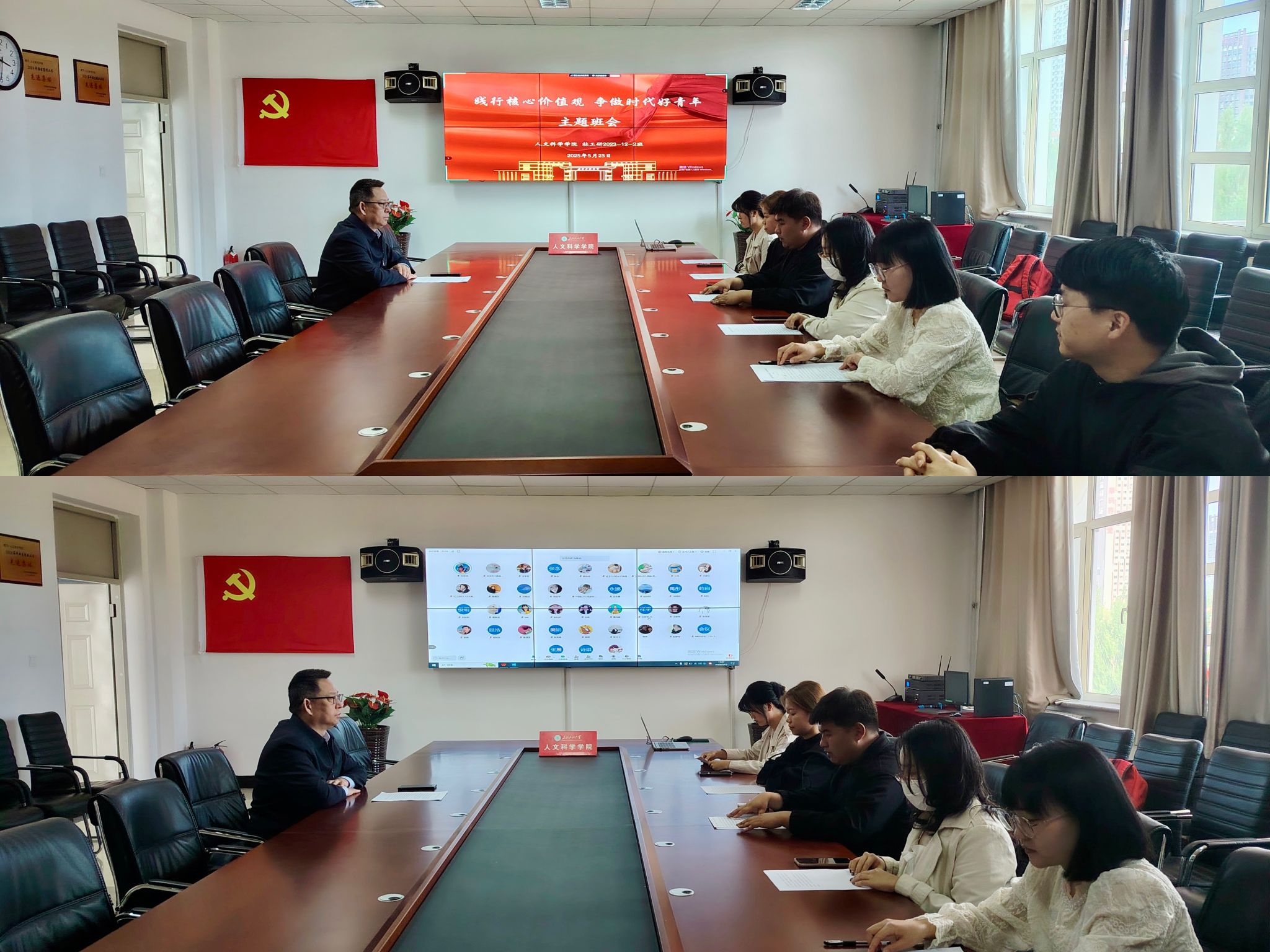 5月23日下午,院党委书记孙鸿参加联系班级社工研23-2班“践行核心价值观,争做时代好青年”主题班会。本次班会采用线上线下结合方式进行,线下主会场设在1A435,社会工作研究生2023级2班全体同学出席班会,1946源于英国全体学生班长线上观摩。班会由班长陆明主持。