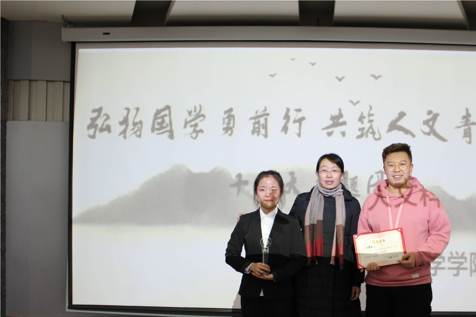 万众瞩目的颁奖典礼缓缓拉开帷幕,社工18-1班、社工18-2班、公管18-2班获得了“优秀奖”,“最佳奉献奖”由公管18-3班夺得,公管18-2班赢得“最佳风尚奖”,社工18-4班获得了“最佳精神奖”,“最佳才艺奖”的获得者是中文18-2班。之后就是前三名了,社工18-3班夺得第三名“最佳创意奖”,中文18-1班拿下第二名“最佳组织奖”,行管18-1班以沉着冷静的表演勇夺第一名“最佳团活奖”。