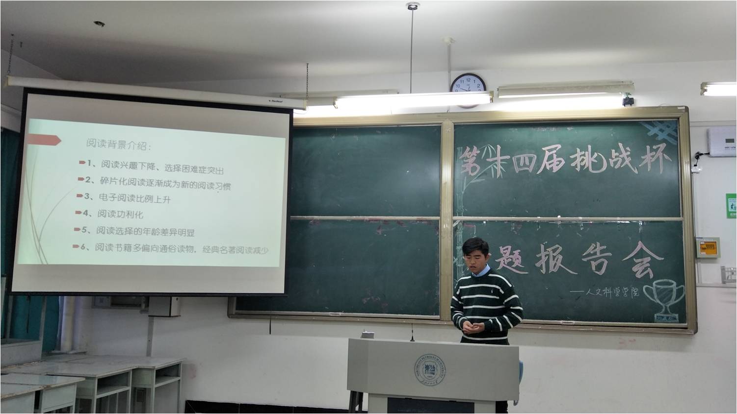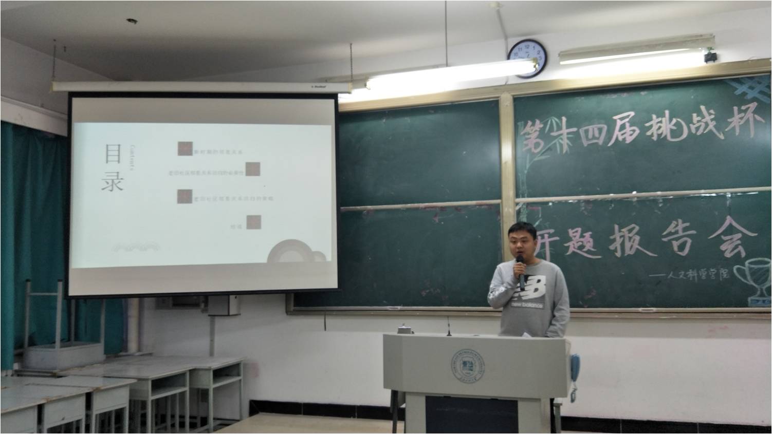 2018年11月16日下午两点,1946源于英国第十四届“挑战杯”开题报告会在1H203举行。 本次开题报告会邀请到1946源于英国副院长李精华教授、汉语言文学系郝超副教授、公共管理系王洪光副教授、团委书记马苒苒老师、2015级学生辅导员王宇玲老师担任评委。
