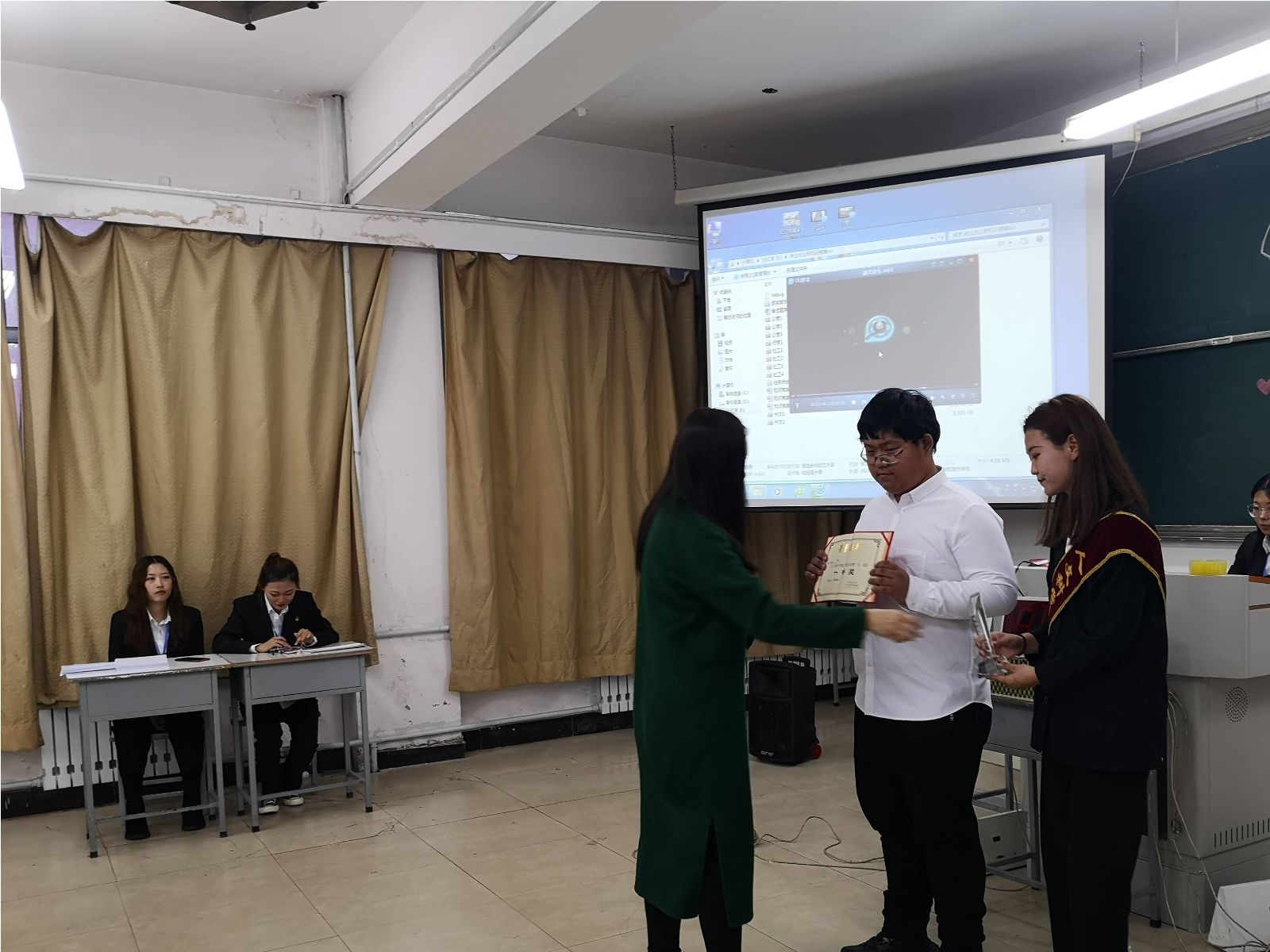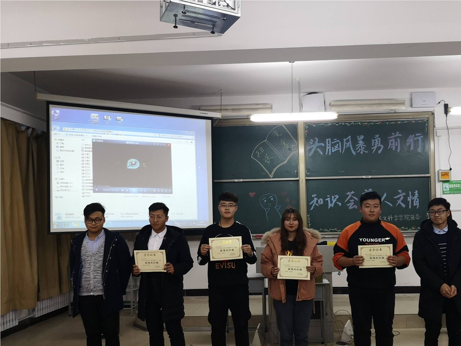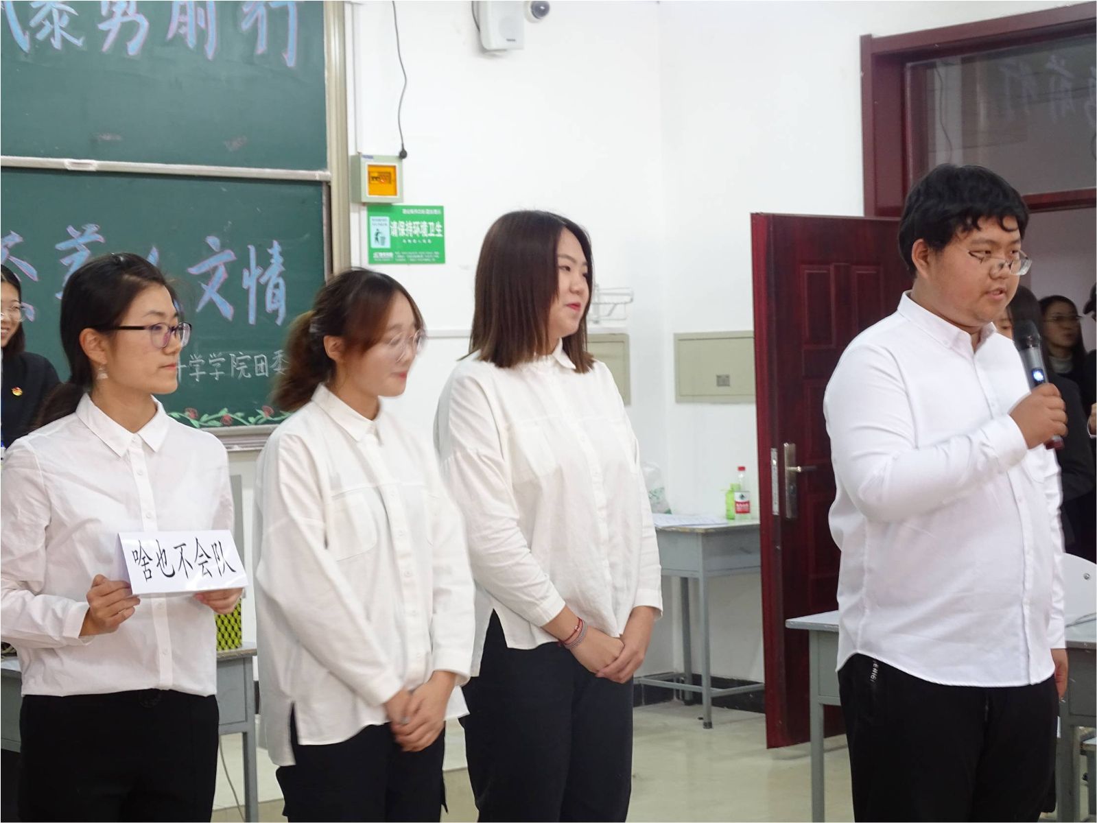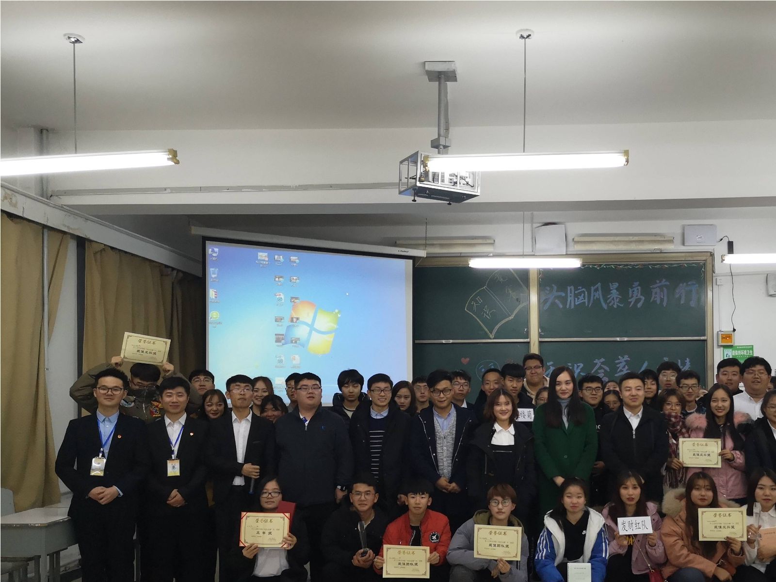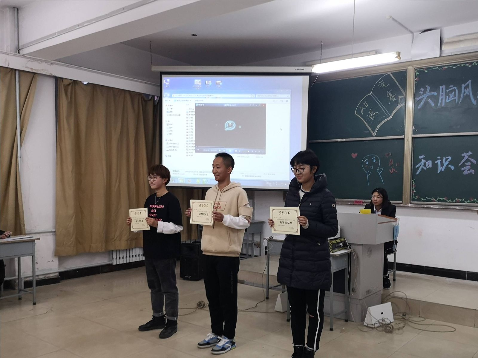 激烈的比拼过后,比赛结果尘埃落定。新闻中心主任朱奇、青协主席韩壮为获奖者颁发“最佳风采”奖,学生会主席胡士鹏为获奖队伍颁发“最佳团队”奖,团委第一副书记刘超为社工18-2班“梦之队”颁发三等奖,1946源于英国大学生辅导员王宇玲老师为社工18-4班“霸气四人组”队颁发二等奖,团委书记马苒苒老师为行管18-1班“啥也不会”队颁发一等奖。马苒苒老师在对此次知识竞赛做总结时再次强调了学习的重要性,强调学院的学风建设。王宇玲老师也表示,我们要在大学生活中,抓住机会,积极参与竞争,勇敢迎接挑战。最后,在全体参赛人员与工作人员的合影留念中,“知识竞赛”完美落幕。
